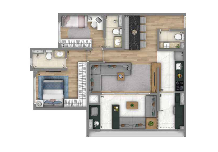 ∙ 1 a 3 suítes, 2 a 4 dorms